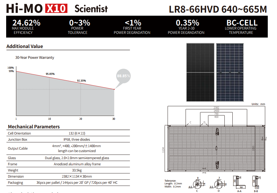 Bảo hành hiệu suất: Thường từ 25-30 năm, đảm bảo hiệu suất pin không giảm quá một ngưỡng nhất định (ví dụ: còn 80-85% sau 25 năm).